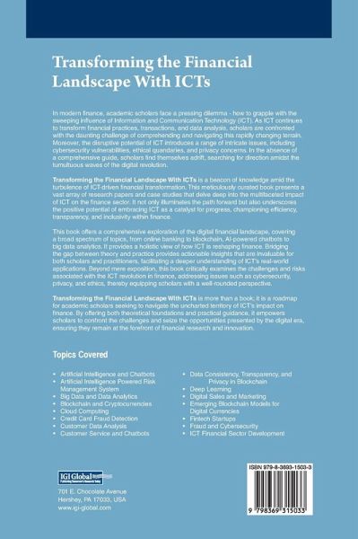 In modern finance, academic scholars face a pressing dilemma - how to grapple with the sweeping influence of Information and Communication Technology (ICT). As ICT continues to transform financial practices, transactions, and data analysis, scholars are confronted with the daunting challenge of comprehending and navigating this rapidly changing terrain. Moreover, the disruptive potential of ICT introduces a range of intricate issues, including cybersecurity vulnerabilities, ethical quandaries, and privacy concerns. In the absence of a comprehensive guide, scholars find themselves adrift, searching for direction amidst the tumultuous waves of the digital revolution. Transforming the Financial Landscape With ICTs is a beacon of knowledge amid the turbulence of ICT-driven financial transformation. This meticulously curated book presents a vast array of research papers and case studies that delve deep into the multifaceted impact of ICT on the finance sector. It not only illuminates the path forward but also underscores the positive potential of embracing ICT as a catalyst for progress, championing efficiency, transparency, and inclusivity within finance.
