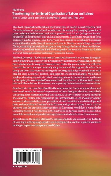 The book develops a 'double comparison' analytical framework to compare the organisation of labour and leisure in the three respective generations, proceeding, on the one hand, diachronically along the historical time, that is, the pre-collective era, collective era and reform era, and synchronically along the women's life stages on the other. In so doing, the book links women's shifting role in changing family/household forms with broader socio-economic, political, demographic and cultural changes. Moreover, it employs a holistic perspective to reflect changing patterns in women's labour and leisure by disrupting the remunerated/unremunerated, home/labour, within/outside household and labour/leisure dichotomies, and exploring the interrelations between them.