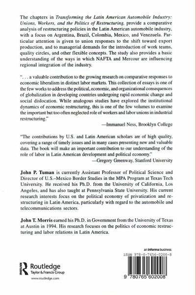 This study looks at union responses to the changes in the Latin American car industry in the last 15 years. It considers the impact of the shift towards export production and regional integration, and the effect of political changes on union reponses.