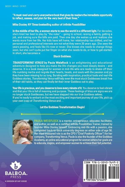 In the middle of her life, a woman starts to see the world in a different light. For decades, she’s tried her best to play by "the rules" – going to school, raising a family, getting a job, and making sure the bills are paid. Then one day she wakes up and realizes she wants more from her life. Her kids have left home, her relationship has shifted, and her personal and professional interests are not what they were 20 years ago. She sees the years passing, and feels like it’s now or never. She knows she needs to change things soon, but she can’t quite put her finger on what she needs to do, or how to get started. In short, she becomes a: Stuck Goddess. TRANSFORMING VENUS by Paula Weisflock is an enlightening and educational adventure designed to help you make the life changes you most deeply desire – and deserve. It is a book designed for women in mid-life who are ready to shake off their life-numbing inertia and reignite their hearts, heads, and souls with the passion and joy they have been missing for so long. Bursting with inspiration, practical tools and real-life Goddess stories, Transforming Venus will help even the most stuck Goddesses break free of their old habits, so they can finally let their inner Goddess out to play. Your life is precious, and you deserve to love every minute of it. You deserve to feel vibrant and that your life is full of meaning and purpose. These feelings of bliss are signs we are no longer stuck Goddesses, but we have stepped into our true Goddess selves. If you’re ready to embark on the most exciting and important journey of your life, pick up your own copy of Transforming Venus and… Let the Goddess Transformation Begin!