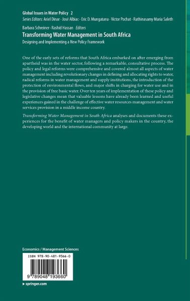 Foreword.- Acknowledgements.- List of Contributors.- Abbreviations.- 1. The Political, Social and Economic Context of Changing Water Policy in South Africa Post-1994.- 2. Water Resource Situation, Strategies and Allocation Regimes in South Africa.- 3. Water Services in South Africa 1994 - 2009.- 4. Water, Sanitation and Wastewater Management: Some Questions for National Water Security in South Africa.- 5. Transforming Legal Access to Water to Redress Social Inequity and Economic Inefficiency.- 6. Protecting Aquatic Ecosystem Health for Sustainable Use.- 7. Catchment Management Agencies: A Case Study of Institutional Reform in South Africa.- 8. National Water Security: Planning and Implementation.- 9. Pricing of Water for Cost Recovery, Economic Efficiency and Social Equity.- 10. Mainstreaming Gender in Water Management in South Africa.- 11. The Role of Information Systems Management in the Management of Water.- 12. The Water Research Commission.- 13. Transboundary Water Management Issues Under the NWA and Regional Collaboration, Policies and Conventions.- 14. Lessons and Conclusions.- Index.