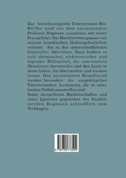 Das neue biotechnologische Unternehmen Bio-RO-Tec wird von dem narzisstischen Professor Rogmann zusammen mit seiner Frau geführt. Das Machtstreben gepaart mit seinem krankhaften Geltungsbedürfnis verleitet ihn zu den unterschiedlichsten kriminellen Aktivitäten. Dazu bedient er sich chemischer, elektronischer und digitaler Hilfsmittel, die unerwartete Situationen hervorrufen und den Leser in Atem halten, ihn überraschen und staunen lassen. Den passionierten Krimiliebhaber werden besonders die ausgeklügelten Tätertechniken faszinieren, die in einer breiten Vielfalt anzutreffen sind.Seine skrupellosen Machenschaften und seine Ignoranz gegenüber der Realität werden Rogmann schließlich zum Verhängnis.