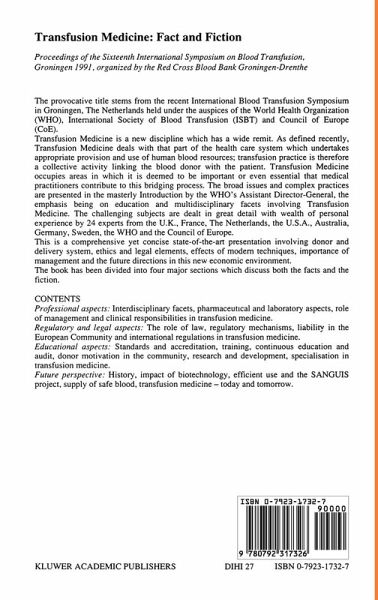 I. Professional Aspects.- Transfusion Medicine: Concept and Interdisciplinary Aspects.- The Pharmaceutical and Laboratory Aspects of Transfusion Medicine.- Role of Management and Administration in Transfusion Medicine.- The Clinical Responsibilities of Transfusion Medicine.- Discussion.- II. Regulatory and Legal Aspects.- Transfusion Medicine: The Role of the Law.- Regulations and Regulatory Mechanisms Related to Transfusion Medicine in the United States of America.- Liability Arising from the Administration of Blood and Blood Products within the European Economic Community.- International Regulations and Legislation in Transfusion Medicine.- Discussion.- III. Educational Aspects.- Standards, Inspection and Accreditation Mechanisms in Transfusion Medicine.- Training in Transfusion Medicine: Programs and Mechanisms.- The Need for Continuous Education and Performance Appraisal.- Transfusion Medicine, Education and the Community: Donor Motivation and Community Oriented Aspects.- Research and Development Programs.- Specialization in Transfusion Medicine by Under- and Postgraduate Training.- Discussion.- IV. Historical Aspects and Future Perspectives.- Transfusion Medicine: Historical Overview The Eras of Serology, Component Production and Fractionation.- Transfusion Medicine: The Impact of Biotechnology, Growth Factors, and Bioengineering.- The SANGUIS Project.- Safety of Transfusions as We Move Toward 2000.- An Improvement in the Supply of Safe Blood: Virus Inactivated Plasma Prepared in the Blood Bank.- Transfusion Medicine Today and Tomorrow: The Facts and the Fictions.- Discussion.