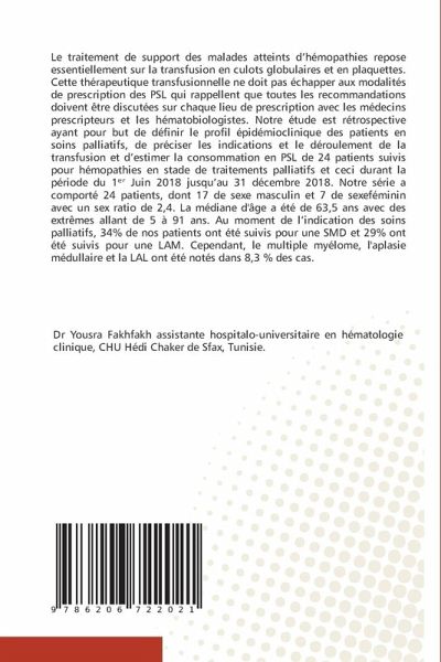 Le traitement de support des malades atteints d'hémopathies repose essentiellement sur la transfusion en culots globulaires et en plaquettes. Cette thérapeutique transfusionnelle ne doit pas échapper aux modalités de prescription des PSL qui rappellent que toutes les recommandations doivent être discutées sur chaque lieu de prescription avec les médecins prescripteurs et les hématobiologistes. Notre étude est rétrospective ayant pour but de définir le profil épidémioclinique des patients en soins palliatifs, de préciser les indications et le déroulement de la transfusion et d'estimer la consommation en PSL de 24 patients suivis pour hémopathies en stade de traitements palliatifs et ceci durant la période du 1 Juin 2018 jusqu'au 31 décembre 2018. Notre série a comporté 24 patients, dont 17 de sexe masculin et 7 de sexeféminin avec un sex ratio de 2,4. La médiane d'âge a été de 63,5 ans avec des extrêmes allant de 5 à 91 ans. Au moment de l'indication des soins palliatifs, 34% de nos patients ont été suivis pour une SMD et 29% ont été suivis pour une LAM. Cependant, le multiple myélome, l'aplasie médullaire et la LAL ont été notés dans 8,3 % des cas.