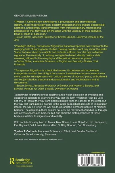 Transgender Migrations brings together a top-notch collection of emerging and established scholars to examine the way that the term "migration" can be used not only to look at the way trans bodies migrate from one gender to the (an?) other, but the way that trans people migrate in the larger geopolitical contexts of immigration reform, the war on terror, the war on drugs, and the increased policing of national borders.