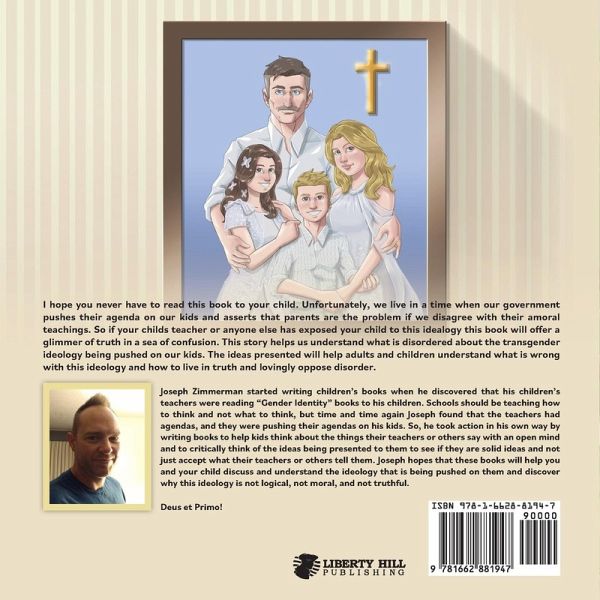I hope you never have to read this book to your child. Unfortunately, we live in a time when our government pushes their agenda on our kids and asserts that parents are the problem if we disagree with their amoral teachings. So if your childs teacher or anyone else has exposed your child to this idealogy this book will offer a glimmer of truth in a sea of confusion. This story helps us understand what is disordered about the transgender ideology being pushed on our kids. The ideas presented will help adults and children understand what is wrong with this ideology and how to live in truth and lovingly oppose disorder. Joseph Zimmerman started writing children's books when he discovered that his children's teachers were reading "Gender Identity" books to his children. Schools should be teaching how to think and not what to think, but time and time again Joseph found that the teachers had agendas, and they were pushing their agendas on his kids. So, he took action in his own way by writing books to help kids think about the things their teachers or others say with an open mind and to critically think of the ideas being presented to them to see if they are solid ideas and not just accept what their teachers or others tell them. Joseph hopes that these books will help you and your child discuss and understand the ideology that is being pushed on them and discover why this ideology is not logical, not moral, and not truthful. Deus et Primo!