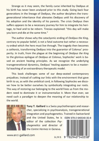 Strange as it may seem, the family curse inherited by Oedipus at his birth has never been analyzed prior to this study. Going back four generations in the lineage of Oedipus, the author deciphers the transgenerational inheritance that alienates Oedipus until his discovery of his adoption and the identity of his parents. The crisis Oedipus then suffers appears to be a necessary journey for him to integrate his heritage, to heal and to be reborn. Tiresias explained: "this day will make you born and die at the same time." The author shows why the cataclysmic ending of Oedipus the King, contrary to popular belief, is not a fatal outcome but rather a necessary ordeal which the hero must live through. The tragedy then becomes a catharsis, transforming Oedipus into the guarantor of Colonus' prosperity. In truth, from the plague at the beginning of Oedipus the King to the glorious epilogue of Oedipus at Colonus, Sophocles' work is based on ancient healing principles. As we recognize the underlying transgenerational dynamics, Oedipus' healing appears to be a masterful teaching of an extraordinary therapeutic model. This book challenges some of our deep-seated contemporary prejudices. Instead of cutting our links with the environment that gave birth to us, as with the umbilical cord, in following Sophocles, we discover how to be better ourselves by symbolically integrating our roots. This way of restoring our belonging to the world frees us from the modern need to dominate it or instrumentalize it. More than ever, we need such a paradigm to deepen the meaning of our relationship to the world.