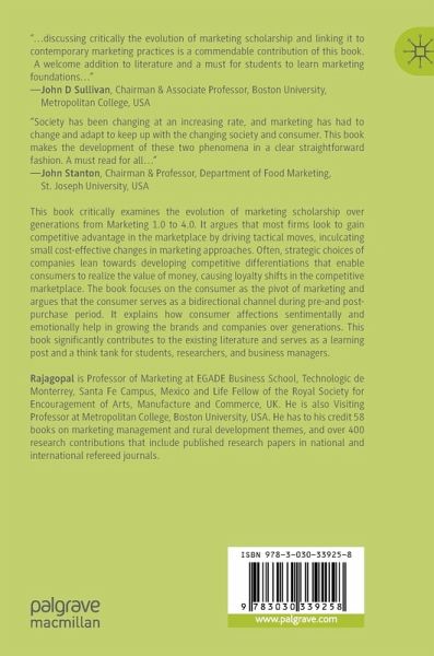 This book critically examines the evolution of marketing scholarship over generations from Marketing 1.0 to 4.0. It argues that most firms look to gain competitive advantage in the marketplace by driving tactical moves, inculcating small cost-effective changes in marketing approaches. Often, strategic choices of companies lean towards developing competitive differentiations that enable consumers to realize the value of money, causing loyalty shifts in the competitive marketplace. The book focuses on the consumer as the pivot of marketing and argues that the consumer serves as a bidirectional channel during pre-and post-purchase period. It explains how consumer affections sentimentally and emotionally help in growing the brands and companies over generations. This book significantly contributes to the existing literature and serves as a learning post and a think tank for students, researchers, and business managers.