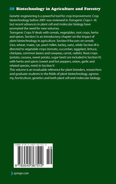 Transgenic Crops IV deals with cereals, vegetables, root crops, herbs and spices. Section I is an introductory chapter on the impact of plant biotechnology in agriculture. Section II focuses on cereals (rice, wheat, maize, rye, pearl millet, barley, oats), while Section III is directed to vegetable crops (tomato, cucumber, eggplant, lettuce, chickpea, common beans and cowpeas, carrot, radish). Root crops (potato, cassava, sweet potato, sugar beet) are included in Section IV, with herbs and spices (sweet and hot peppers, onion, garlic and related species, mint) in Section V.