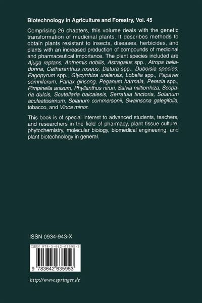 Comprising 26 chapters, this volume deals with the genetic transformation of medicinal plants. It describes methods to obtain plants resistant to insects, diseases, herbicides, and plants with an increased production of compounds of medicinal and pharmaceutical importance. The plant species included are Ajuga reptans, Anthemis nobilis, Astragalus spp., Atropa belladonna, Catharanthus roseus, Datura spp., Duboisia leichhardtii, Fagopyrum spp., Glycyrrhiza uralensis, Lobelia spp., Papaver somniferum, Panax ginseng, Peganum hamala, Perezia spp., Pimpinella anisum, Phyllanthus niruri, Salvia miltiorrhiza, Scoparia dulcis, Scutellaria baicalesis, Serratula tinctoria, Solanum aculeatissimum, Solanum commersonii, Swainsona galegifolia, tobacco, andVinca minor.