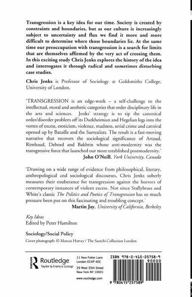 In this fast moving study, Chris Jenks ranges widely over the history of ideas, the major theorists, and the significant moments in the formation of the idea of transgression. He looks at the definition of the social and its boundaries by Durkheim, Douglas and Freud, at the German tradition of Hegel and Nietzsche and the increasing preoccupation with transgression itself in Baudelaire, Bataille and Foucault. The second half of the book looks at transgression in action in the East End myth of the Kray twins, in Artaud's theatre of cruelty, the spectacle of the Situationists and Bakhtin's analysis of carnival. Finally Jenks extends his treatment of transgression to its own extremity.