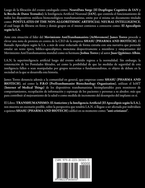 Luego de la filtración del evento catalogado como: NeuroData Surge (El Despliegue Cognitivo de IAN y la Brecha de Datos Textuales); la Inteligencia Artificial Neuronal (IAN), que controla el funcionamiento de todos los dispositivos médicos biotecnológicos transhumanistas, emite por sí misma un documento titulado como: POSTULATES OF THE NON-ALGORITHMIC ARTIFICIAL NEURAL INTELLIGENCE, el cual luego de filtrarse en foros y demás grupos en el intenet comienza a conocerse como: El Apocalipsis según la I.A. Ante esta situación el líder del Movimiento AntiTranshumanista (AtMovement) James Torres procede a elevar una nota de protesta en contra de la CEO de la empresa SHASU (PHARMA AND BIOTECH). El llamado Apocalipsis según la I.A. a más de estar redactado de forma extraña con una narrativa que pretende emular un texto épico, bíblico-apocalíptico; menciona despectivamente a miembros y simpatizantes del Movimiento AntiTranshumanista mundial como su hermano Joshua Torres y al autor Juan Quiñónez-Albán. I.A.N, la superinteligencia artificial luego del evento referido regresa a la normalidad. Sin embargo, la connotación de los Postulados filtrados, así como la posibilidad de que las medidas de seguridad de esta inteligencia fallen o sean manipuladas por grupos terroristas o fundamentalistas, es objeto de debate en la sociedad en la que se desarrolla esta historia. James Torres denuncia además a la comunidad en general, que empresas como SHASU (PHARMA AND BIOTECH), así como la P.B.O (ProTranshumanist Biotechnology Organization), utilizan el IoMT (Internet of Medical Things) de los dispositivos transhumanistas bioimplantables para monitoreo de comportamientos, recopilación de información y espionaje de los pacientes y personas a su alredor; más que para contribuir al mejoramiento de la salud o como medida de incremento del desempeño del implante en sí. El Libro: TRANSHUMANISMO: El Anticristo y la Inteligencia Artificial (El Apocalipsis según la I.A.), nos muestra un escenario posible, sobre la perspectiva que tendría I.A.N. si llegase a ser afectada por individuos a quienes SHASU (PHARMA AND BIOTECH) calificó en su momento como: "anti-cristianos".