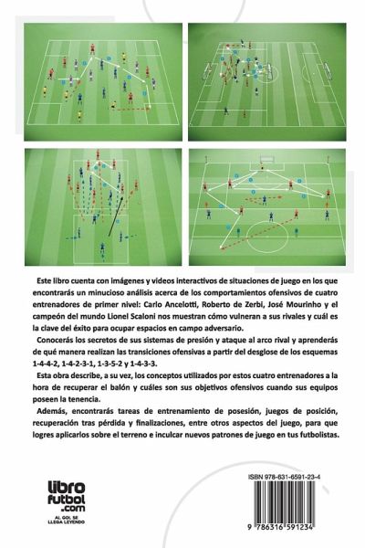 Este libro cuenta con imágenes y videos interactivos de situaciones de juego en los que encontrarás un minucioso análisis acerca de los comportamientos ofensivos de cuatro entrenadores de primer nivel: Carlo Ancelotti, Roberto de Zerbi, José Mourinho y el campeón del mundo Lionel Scaloni nos muestran cómo vulneran a sus rivales y cuál es la clave del éxito para ocupar espacios en campo adversario. Conocerás los secretos de sus sistemas de presión y ataque al arco rival y aprenderás de qué manera realizan las transiciones ofensivas a partir del desglose de los esquemas 1-4-4-2, 1-4-2-3-1, 1-3-5-2 y 1-4-3-3. Esta obra describe, a su vez, los conceptos utilizados por estos cuatro entrenadores a la hora de recuperar el balón y cuáles son sus objetivos ofensivos cuando sus equipos poseen la tenencia. Además, encontrarás tareas de entrenamiento de posesión, juegos de posición, recuperación tras pérdida y finalizaciones, entre otros aspectos del juego, para que logres aplicarlos sobre el terreno e inculcar nuevos patrones de juego en tus futbolistas.