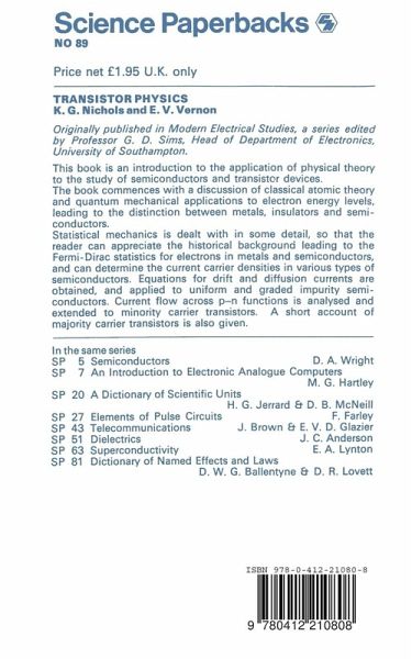 This book is intended as an introduction to the application of physical theory to the study of semiconductors and transistor devices. The book is based on lecture courses given by the authors to second and third year honours students in the Electronics Department of Southampton University, England. Some elementary knowledge of physics, circuit theory, and vector methods is assumed. The book deals almost exc1u sively with the theoretical aspects, but references are given to experi mental work. The first two chapters discuss c1assical atomic theory and quantum mechanical applications to electron energy levels in atoms, in particular the hydrogen atom, and in one-dimensional crystalline solids leading to the distinctions between metals, insulators, and semiconductors. Chapter 3 deals with statistical mechanics in some detail, so that the reader can appreciate the historical background leading to the Fermi Dirac statistics for electrons in metals and semiconductors, and in chapter 4 these statistics are applied to determine the current carrier density in various types of semiconductor. Equations for drift and diffusion currents are obtained in chapter 5, and the results applied to uiliform and graded impurity semiconductors in chapter 6. Current flow across p-n junctions is analysed in chapter 7, and the p-n-p transistor theory is developed in chapter 8. The discussion is limited to p-n-p transistors, but similar results apply for the n-p-n transistor.