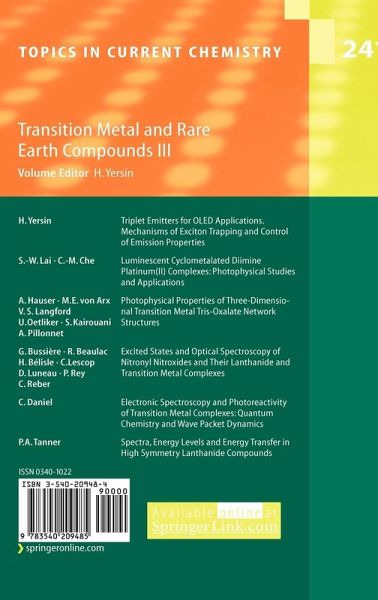 H. Yersin: Triplet Emitters for OLED Applications. Mechanisms of Exciton Trapping and Control of Emission Properties.- S.-W. Lai, C.-M. Che: Luminescent Cyclometalated Diimine Platinum(II) Complexes. Photophysical Studies and Applications.- A. Hauser, M.E. von Arx, V.S. Langford, U. Oetliker, S. Kairouani, A. Pillonnet: Photophysical Properties of Three-Dimensional Transition Metal Tris-Oxalate Network Structures.- B. Bussière, R. Beaulac, H. Bélisle, C. Lescop, D. Luneau, P. Rey, C. Reber: Excited States and Optical Spectroscopy of Nitronyl Nitroxides and Their Lanthanide and Transition Metal Complexes.- C. Daniel: Electronic Spectroscopy and Photoreactivity of Transition Metal Complexes: Quantum Chemistry and Wave Packet Dynamics.- P.A. Tanner: Spectra, Energy Levels and Energy Transfer in High Symmetry Lanthanide Compounds.