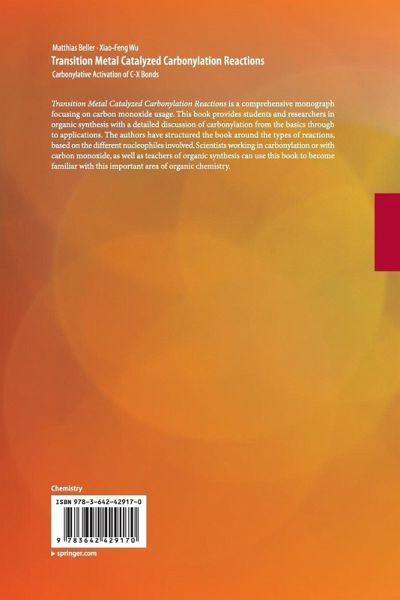 Introduction.- Hydroxy, Alkoxy and Aminocarbonylation of C-X bonds.- Reductive carbonylations.- Carbonylative coupling reactions with organometallic reagents.- Carbonylative Sonogashira reactions.- Carbonylative C-H activations.- Carbonylative Heck reactions.- Oxidative carbonylation reactions.- Reaction of C-NO2 with CO.- Applications in total synthesis.- A discussion between carbonylation, noncarbonylation and decarbonylation.- Outlook.