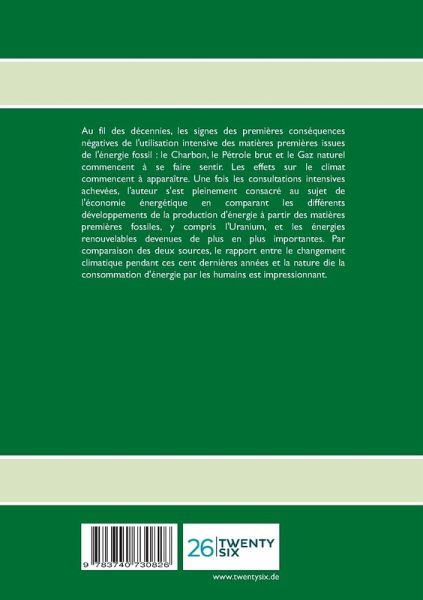 Au fil des décennies, les signes des premières conséquences négatives de l'utilisation intensive des matières premières issues de l'énergie fossil : le Charbon, le Pétrole brut et le Gaz naturel commencent à se faire sentir. Les effets sur le climat commencent à apparaître. Une fois les consultations intensives achevées, l'auteur s'est pleinement consacré au sujet de l'économie énergétique en comparant les différents développements de la production d'énergie à partir des matières premières fossiles, y compris l'Uranium, et les énergies renouvelables devenues de plus en plus importantes. Par comparaison des deux sources, le rapport entre le changement climatique pendant ces cent dernières années et la nature die la consommation d'énergie par les humains est impressionnant.