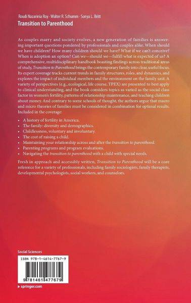 Transition to Parenthood moves beyond a one-study focus and captures multidisciplinary work on all families making the transition to parenthood. The book covers societal trends, changes, and most importantly expectations. Focus is also placed on how families are impacted by their surroundings and their individual members. Strengths and limitations of current theories are discussed, as well as how the phenomenon of parenthood requires a combination of both macro- and micro-level theories.