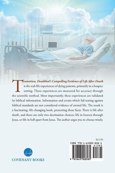 Transition; Deathbed's Compelling Evidence of Life After Death is the real-life experiences of dying patients, primarily in a hospice setting. These experiences are measured for accuracy through the scientific method. Most importantly, these experiences are validated by biblical information. Information and events which fail testing against biblical standards are not considered evidence of eternal life. The result is a fascinating, life-changing book, presenting these facts: There is life after death, and there are only two destination choices; life in heaven through Jesus, or life in hell apart from Jesus. The author urges you to choose wisely.