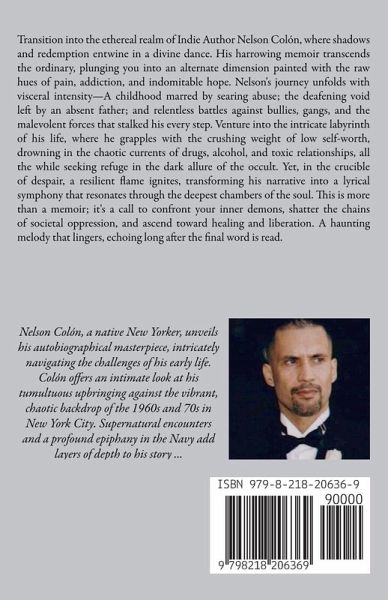Transition into the ethereal realm of Indie Author Nelson Colón, where shadows and redemption entwine in a divine dance. His harrowing memoir transcends the ordinary, plunging you into an alternate dimension painted with the raw hues of pain, addiction, and indomitable hope. Nelson's journey unfolds with visceral intensity-A childhood marred by searing abuse; the deafening void left by an absent father; and relentless battles against bullies, gangs, and the malevolent forces that stalked his every step. Venture into the intricate labyrinth of his life, where he grapples with the crushing weight of low self-worth, drowning in the chaotic currents of drugs, alcohol, and toxic relationships, all the while seeking refuge in the dark allure of the occult. Yet, in the crucible of despair, a resilient flame ignites, transforming his narrative into a lyrical symphony that resonates through the deepest chambers of the soul. This is more than a memoir; it's a call to confront your inner demons, shatter the chains of societal oppression, and ascend toward healing and liberation. A haunting melody that lingers, echoing long after the final word is read. Nelson Colón, a native New Yorker, unveils his autobiographical masterpiece, intricately navigating the challenges of his early life. Through personal journals, Colón offers an intimate look at his tumultuous upbringing against the vibrant, chaotic backdrop of the 1960s and 70s in New York City. Supernatural encounters and a profound epiphany during his Navy service add layers of depth to this remarkable story, making it a vivid exploration of resilience, redemption, and the regenerative human spirit. {Approximately 228 pgs.}