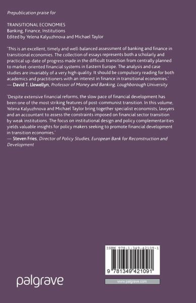 Dedication List of Tables and Figures Foreword List of Abbreviation Notes on the Contributors Introduction; Y.Kalyuzhnova & M.Taylor Developing Market Institutions in Transitional Economies; A.Shrivastava PART I: THE DEVELOPMENT OF THE BANKING SECTOR Bad Loans as Alternatives to Fiscal Transfers in Transition Economies; G.Tridimas Banking Transformations in Poland; K.Szymkiewicz PART II: NON-BANK REFORMS AND DEVELOPMENT OF FINANCIAL SECTOR Development of Capital Markets, Stock Exchanges and Securities Regulation in Transition Economies; J.Norton & D.Arner The Romanian Accounting Reforms: Another Case of Cultural Intrusion?; A.Roberts Reforming Pension System in Transitional Economies: Case Study Kazakhstan; Y.Kalyuzhnova PART III: SUPERVISION AND REGULATION OF FINANCIAL MARKETS International Standards and the Transitional Economies; D.Arner Building Supervisory Capacity in the Transition Economies; M.Taylor Conclusion; Y.Kalyuzhnova & M.Taylor Index