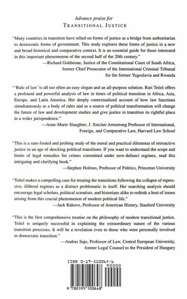 At the century's end, societies all over the world are moving from authoritarian rule to democracy. At any such time of radical change, the question arises: should a society punish its ancien regime or let bygones by bygones? Transitional Justice takes the debate to a new level with an interdisciplinary approach that challenges the very terms of the contemporary debate. Teitel explores the recurring question of how regimes should respond to evil rule, arguing against the prevailing view favoring punishment, and contending through historical and comparative illustrations that the law nevertheless plays a profound role in periods of radical change. She proposes a new normative conception of justice -- one that is highly politicized -- offering glimmerings of the rule of law that, in her view, have become symbols of liberal transition.