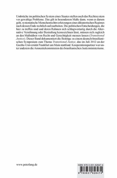 Umbrüche im politischen System eines Staates stellen auch das Rechtssystem vor gewaltige Probleme. Das gilt in besonderem Maße dann, wenn es darum geht, systematische Menschenrechtsverletzungen eines diktatorischen Regimes nach dessen Ende rechtlich aufzuarbeiten. Die politischen Entscheidungen, die hier zu treffen sind und deren Rahmen sich schlagwortartig durch die Alternative Versöhnung oder Bestrafung kennzeichnen lässt, müssen sich zugleich an den Maßstäben von Recht und Gerechtigkeit messen lassen (Transitional Justice). Dieser Band dokumentiert die Beiträge zu einem deutsch-brasilianischen Symposium zum Thema Transitional Justice, das im Juli 2012 an der Goethe-Universität Frankfurt am Main stattfand. Kooperationspartner war unter anderem die Amnestiekommission des brasilianischen Justizministeriums.