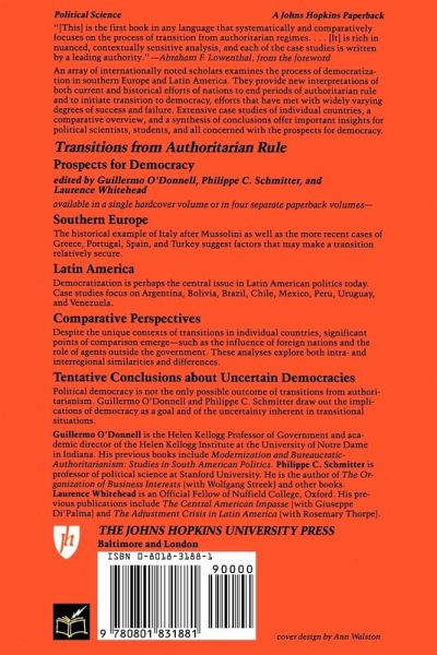 An array of internationally noted scholars examines the process of democratization in southern Europe and Latin America. They provide new interpretations of both current and historical efforts of nations to end periods of authoritarian rule and to initiate transition to democracy, efforts that have met with widely varying degrees of success and failure. Extensive case studies of individual countries, a comparative overview, and a synthesis conclusions offer important insights for political scientists, students, and all concerned with the prospects for democracy. Southern Europe The historical example of Italy after Mussolini as well as the more recent cases of Greece, Portugal, Spain, and Turkey suggest factors that may make a transition relatively secure. Latin America Democratization is perhaps the central issue in Latin American politics today. Case studies focus on Argentina, Bolivia, Brazil, Chile, Mexico, Peru, Uruguay and Venezuela. Comparative Perspectives Despite the unique contexts of transitions in individual countries, significant points of comparison emerge -- such as the influence of foreign nations and the role of agents outside the government. These analyses explore both intra- and interregional similarities and differences. Tentative Conclusions about Uncertain Democracies Political democracy is not the only possible outcome of transitions from authoritarianism. Guillermo O'Donnell and Philippe C. Schmitter draw out the implications of democracy as a goal and of the uncertainty inherent in transitional situations.
