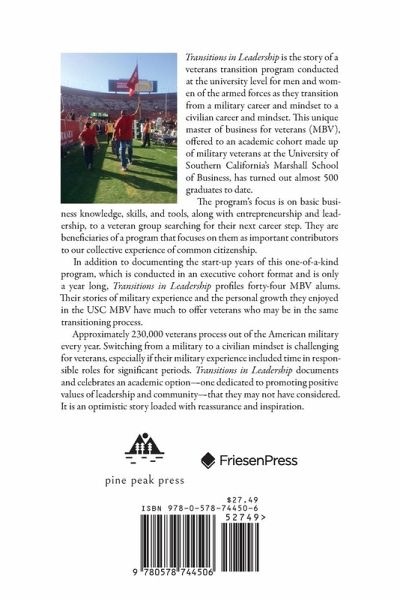 Transitions in Leadership is the story of a veterans' transition program conducted at the university level for men and women of the armed forces as they transition from a military career and mindset to a civilian career and mindset. This unique master of business for veterans (MBV), offered to an academic cohort made up of military veterans at the University of Southern California's Marshall School of Business, has turned out almost 500 graduates to date. The program's focus is on basic business knowledge, skills, and tools, along with entrepreneurship and leadership, to a veteran group searching for their next career step. They are beneficiaries of a program that focuses on them as important contributors to our collective experience of common citizenship. In addition to documenting the start-up years of this one-of-a-kind program, which is conducted in an executive cohort format and is only a year long, Transitions in Leadership profiles forty-four MBV alums. Their stories of military experience and the personal growth they enjoyed in the USC MBV have much to offer veterans who may be in the same transitioning process. Approximately 230,000 veterans process out of the American military every year. Switching from a military to a civilian mindset is challenging for veterans, especially if their military experience included time in responsible roles for significant periods. Transitions in Leadership documents and celebrates an academic option-one dedicated to promoting positive values of leadership and community-that they may not have considered. It is an optimistic story loaded with reassurance and inspiration.