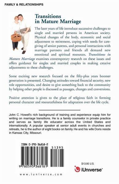 The later years of life introduce successive challenges to single and married persons in American society. Physical changes of the body, economic and social adjustment to retirement, coping with needs for care-giving of senior parents, and personal interactions with marriage partners and friends all demand new emotional and spiritual resources. Transitions in Mature Marriage examines contemporary research on these issues and offers guidance for singles and married couples in making creative adjustments to these challenges. Some exciting new research focused on the fifty-plus years boomer generation is presented. Changing attitudes toward financial security, new role opportunities, and desire to give something back to the community by helping other people is discussed as passages, changes and conversions. Positive attention is given to the place of religious faith in forming personal character and resourcefulness for adaptation over the life cycle.