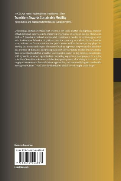 Delivering a sustainable transport system is not just a matter of adopting a number of technological innovations to improve performance in terms of people, planet, and profits. A broader structural and societal transition is needed in technology, as well as in institutions, behavioural patterns, and the economy as a whole. In this broader view, neither the free market nor the public sector will be the unique key player in making this transition happen. Elements of such an approach are presented in this book in a number of domains: integrating transport infrastructure and land use planning, thus connecting fields that are rather unconnected in day-to-day policies; experiments with dynamic transport optimization, including reports on pilot projects to test the viability of transitions; towards reliable transport systems, describing a reversal from supply-driven towards demand-driven approaches; and sustainable logistics and traffic management, from 'local' city distribution to global closed supply chain loops.