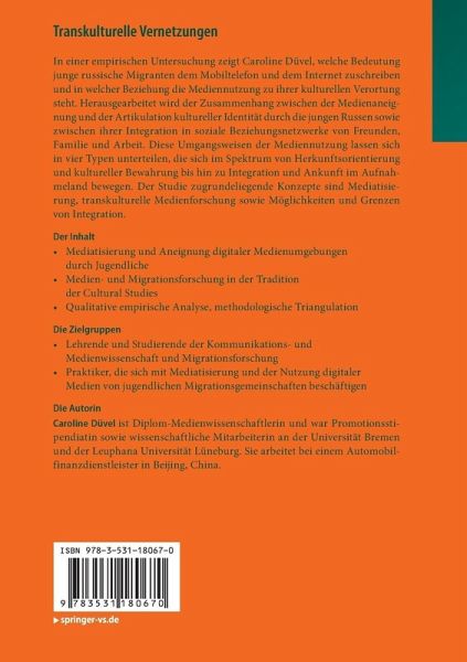 In einer empirischen Untersuchung zeigt Caroline Düvel, welche Bedeutung junge russische Migranten dem Mobiltelefon und dem Internet zuschreiben und in welcher Beziehung die Mediennutzung zu ihrer kulturellen Verortung steht. Herausgearbeitet wird der Zusammenhang zwischen der Medienaneignung und der Artikulation kultureller Identität durch die jungen Russen sowie zwischen ihrer Integration in soziale Beziehungsnetzwerke von Freunden, Familie und Arbeit. Diese Umgangsweisen der Mediennutzung lassen sich in vier Typen unterteilen, die sich im Spektrum von Herkunftsorientierung und kultureller Bewahrung bis hin zu Integration und Ankunft im Aufnahmeland bewegen. Der Studie zugrundeliegende Konzepte sind Mediatisierung, transkulturelle Medienforschung sowie Möglichkeiten und Grenzen von Integration.