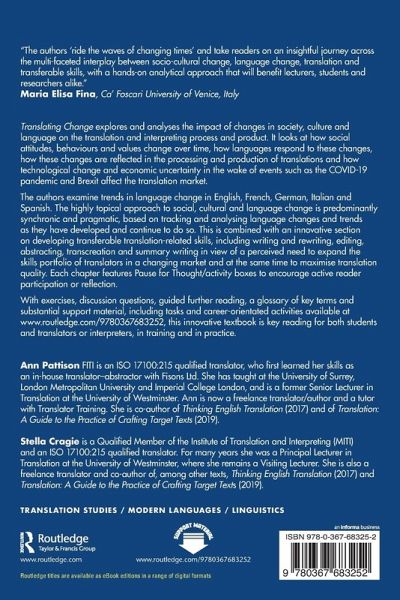 Translating Change explores and analyses the impact of changes in society, culture and language on the translation and interpreting process and product. It looks at how social attitudes, behaviours and values change over time, how languages respond to these changes, how these changes are reflected in the processing and production of translations and how technological change and economic uncertainty in the wake of events such as the COVID-19 pandemic and Brexit affect the translation market.