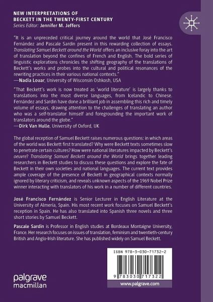 SECTION I: NORTHERN EUROPE.- 1. Embraces - Empty Spaces: The Translation and Reception of Samuel Beckett in Iceland.- 2. Beckett in Sweden Then and Now: (Re)Translating Waiting for Godot.- 3. Stopped in Holland: Samuel Beckett in Dutch Translation.- SECTION II: SOUTHERN EUROPE AND SOUTH AMERICA.- 4. "Half in Love": The Translation and Reception of Samuel Beckett in Spain.- 5. "My Italian is not up to more": Samuel Beckett, Editor of "Immobile".- 6. Translations of Beckett's Work in Argentina.- 7. The Meremost Minimum: Beckett's Translations into Brazilian Portuguese.- SECTION III: MIDDLE EAST AND ASIA.- 8. Translating Samuel Beckett into a "Non-Western" Culture - the Journey of Waiting for Godot in Turkey.- 9. Beckett in "A Distant Place": Early Translations in Hebrew.- 10. Domesticating Beckett: The Religious and Political Complexity of Pakistan and Waiting for Godot.- 11. Translating Samuel Beckett into Hindi.- 12. From Bits and Pieces to an Ensemble: Translating Samuel Beckett in Mainland China.