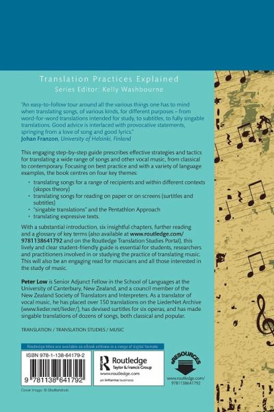 With a substantial introduction, six insightful chapters, further reading and a glossary of key terms (also available at https://www.routledge.com/9781138641792 and on the Routledge Translation Studies Portal), this lively and clear student-friendly guide is essential for students, researchers and practitioners involved in or studying the practice of translating music. This willalso be an engaging read for musicians and all those interested in the study of music.