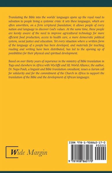 Translating the Bible into the worlds' languages opens up the royal road to salvation to people living a systemic crisis: it sets these languages, which are often unwritten, on a firm scriptural foundation; it allows people of every nation and language to discover God's values. At the same time, these people are keenly aware of the need to improve agricultural technology for more efficient food production, access to health care, a more democratic political system, social justice and education. Yet every situation where a written form of the language of a people has been developed, and materials for teaching reading and writing have been distributed, has led to the opening up of possibilities for their physical and spiritual development. Based on over thirty years of experience in the ministry of Bible translation in Togo and elsewhere in Africa with Wycliffe and SIL World Alliance, the author, Dr. Napo Poidi, a linguist and Bible translation consultant, issues a clarion call for solidarity and for the commitment of the Church in Africa to support the translation of the Bible and the development of African languages.