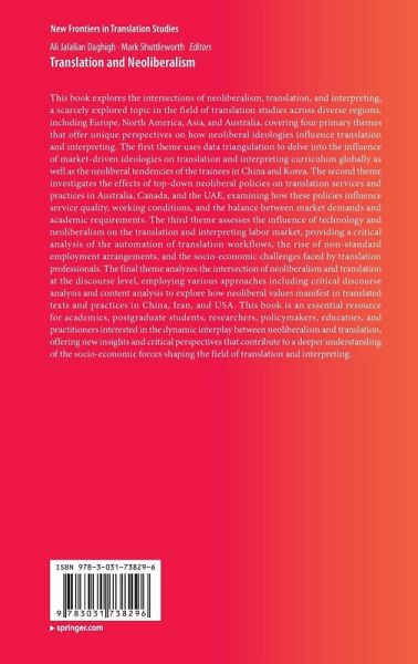 Chapter 1. Introduction.- Part I: Neoliberalism Tendencies in Translation and Interpreting Education: Perspectives on Universities and Students.- Chapter 2. Translator Training in the Context of Neoliberalism: Balancing Academic Expectations and Market Forces.- Chapter 3. Translation Entrepreneurship among Translation and Interpreting Students: A Qualitative Inquiry in the Chinese Setting.- Chapter 4. In pursuit of Interpreting in Neoliberal Korea.- Part II: Neoliberal Policies and Translation Services.- Chapter 5. Community Translation and Interpretating under Neoliberal Agendas: The Cases of Australia and Canada.- Chapter 6. Impact of Neoliberalism on Public-sector Translation in Canada.- Chapter 7. Unpacking Language of Neoliberalism and Globalisation on the Linguistic Landscape of Superdiverse Dubai's posh JBR and Dubai Marina areas: Official Policy, Translation, the Juggernaut of English and 'fake' Arabic.- Part III: Neoliberalism, Technology and Labour Market Transformation in Translation and Interpreting Profession.- Chapter 8. Welcome to the (Translation) Machine! Translation Labour in Times of TechnoTriumphalism.- Chapter 9. Neoliberal Practices Endangering the Sustainability of the Translation Profession: Non-Standard Forms of Work, Labor Monopsonies, and Technology as a Catalyst for Precarization.- Chapter 10. Interpreting one's way through the gig economy: Neoliberal Shifts and the Platformization of Interpretation Work.- Chapter 11. Navigating Neoliberal Risks in Online Collaborative Literary Translation: A Case Study on Translators' Self-Efficacy and Risk Management in the Chinese Context.- Part V: Neoliberal Discourses in Translation.- Chapter 12. Children as Global Subjects: A Comparison of Translated Picture Books in the US and China.- Chapter 13. The Discourse of Neoliberalism in Translated and Domestically Produced Children's Literature in Iran.- Chapter 14. (De) emphasization of Neoliberalism Discourse in Translated and Domestic News on Education in China.