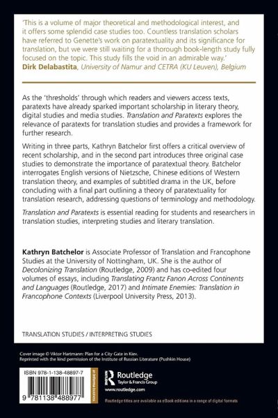 As the 'thresholds' through which readers and viewers access texts, paratexts have already sparked important scholarship in literary theory, digital studies and media studies. Translation and Paratexts explores the relevance of paratexts for translation studies and provides a framework for further research. Writing in three parts, Kathryn Batchelor first offers a critical overview of recent scholarship, and in the second part introduces three original case studies to demonstrate the importance of paratextual theory. Batchelor interrogates English versions of Nietzsche, Chinese editions of Western translation theory, and examples of subtitled drama in the UK, before concluding with a final part outlining a theory of paratextuality for translation research, addressing questions of terminology and methodology. Translation and Paratexts is essential reading for students and researchers in translation studies, interpreting studies and literary translation.