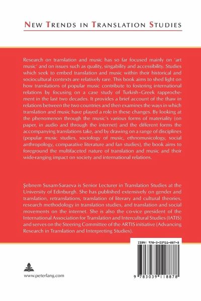 Research on translation and music has so far focused mainly on "art music" and on issues such as quality, singability and accessibility. Studies which seek to embed translation and music within their historical and sociocultural contexts are relatively rare. This book aims to shed light on how translations of popular music contribute to fostering international relations by focusing on a case study of Turkish-Greek rapprochement in the last two decades. It provides a brief account of the thaw in relations between the two countries and then examines the ways in which translation and music have played a role in these changes. By looking at the phenomenon through the music's various forms of materiality (on paper, in audio and through the internet) and the different forms the accompanying translations take, and by drawing on a range of disciplines (popular music studies, sociology of music, ethnomusicology, social anthropology, comparative literature and fan studies), the book aims to foreground the multifaceted nature of translation and music and their wide-ranging impact on society and international relations.
