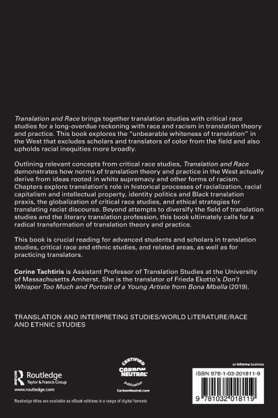 Outlining relevant concepts from critical race studies, Translation and Race demonstrates how norms of translation theory and practice in the West actually derive from ideas rooted in white supremacy and other forms of racism. Chapters explore translation's role in historical processes of racialization, racial capitalism and intellectual property, identity politics and Black translation praxis, the globalization of critical race studies, and ethical strategies for translating racist discourse. Beyond attempts to diversify the field of translation studies and the literary translation profession, this book ultimately callsfor a radical transformation of translation theory and practice.