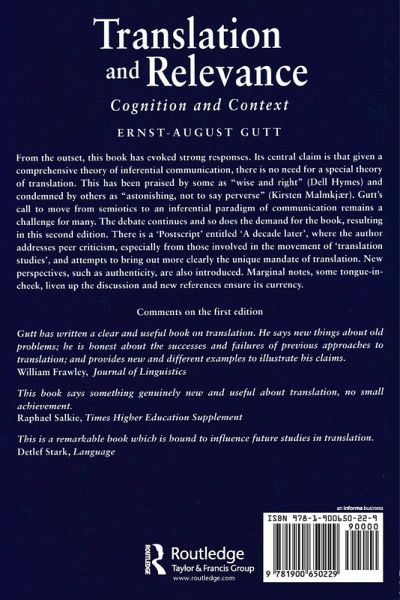 From the outset, this book has evoked strong responses. Its central claim is that given a comprehensive theory of inferential communication, there is no need for a special theory of translation. This has been praised by some as "wise and right" (Dell Hymes) and condemned by others as "astonishing, not to say perverse" (Kirsten Malmkjaer). Gutt's call to move from semiotics to an inferential paradigm of communication remains a challenge for many. The debate continues and so does the demand for the book, resulting in this second edition. There is a 'Postscript' entitled 'A decade later', where the author addresses peer criticism, especially from those involved in the movement of 'translation studies', and attempts to bring out more clearly the unique mandate of translation. New perspectives, such as authenticity, are also introduced. Marginal notes, some tongue-in-cheek, liven up the discussion and new references ensure its currency.