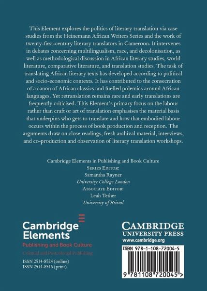 This Element explores the politics of literary translation via case studies from the Heinemann African Writers Series and the work of twenty-first-century literary translators in Cameroon. It intervenes in debates concerning multilingualism, race and decolonization, as well as methodological discussion in African literary studies.
