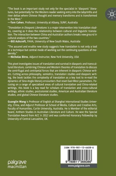 This book investigates issues of translation and survival in diasporic and transcultural literature, combining Chinese and Western theories of translation to discuss the centrifugal and centripetal forces that are inherent in diasporic Chinese writers. Cutting across philosophy, semiotics, translation studies and diasporic writing, it the book tackles the complexity of translation as a key tool to re-read the dynamics of Sino-Anglo literary encounters that reset East-West parameters. Focusing on a range of specialized areas of cultural translation sand China-related writings, this book is a key read for scholars of translation and cross-cultural writings, ethnic studies, postcolonial studies, American and Australian literature studies, and global Chinese literature studies.