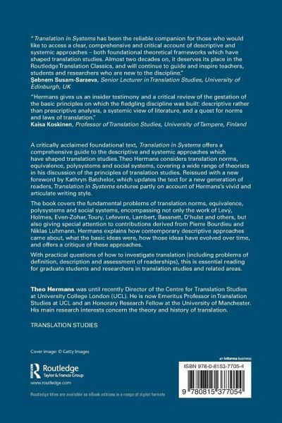A critically acclaimed foundational text, Translation in Systems offers a comprehensive guide to the descriptive and systemic approaches which have shaped translation studies. Theo Hermans considers translation norms, equivalence, polysystems and social systems, covering a wide range of theorists in his discussion of the principles of translation studies. Reissued with a new foreword by Kathryn Batchelor, which updates the text for a new generation of readers, Translation in Systems endures partly on account of Hermans's vivid and articulate writing style. The book covers the fundamental problems of translation norms, equivalence, polysystems and social systems, encompassing not only the work of Levý, Holmes, Even-Zohar, Toury, Lefevere, Lambert, Bassnett, D'hulst and others, but also giving special attention to contributions derived from Pierre Bourdieu and Niklas Luhmann. Hermans explains how contemporary descriptive approaches came about, what the basic ideas were, how those ideas have evolved over time, and offers a critique of these approaches. With practical questions of how to investigate translation (including problems of definition, description and assessment of readerships), this is essential reading for graduate students and researchers in translation studies and related areas.