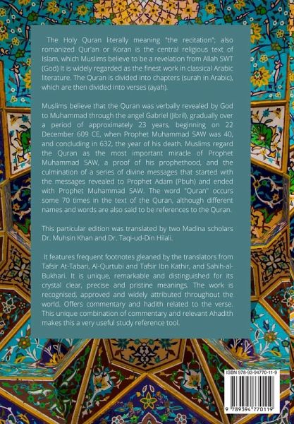 The Holy Quran literally meaning "the recitation"; also romanized as Qur'an or Koran is the central religious text of Islam, which Muslims believe to be a revelation from Allah (swt) (God). The Quran is divided into chapters (surah in Arabic), which are then divided into verses (ayah). Muslims believe that the Quran was verbally revealed by God to Muhammad through the angel Gabriel (Jibril), gradually over a period of approximately 23 years, beginning on 22 December 609 CE, when Prophet Muhammad SAW was 40, and concluding in 632, the year of his death. Muslims regard the Quran as the most important miracle of Prophet Muhammad SAW, a proof of his prophethood, and the culmination of a series of divine messages that started with the messages revealed to Prophet Adam (Pbuh) and ended with Prophet Muhammad SAW. The word "Quran" occurs some 70 times in the text of the Quran, although different names and words are also said to be references to the Quran. This particular edition was translated by two Madina based scholars Dr. Muhsin Khan and Dr. Taqi-ud-Din Hilali. It features frequent footnotes gleaned by the translators from Tafsir At-Tabari, Al-Qurtubi and Tafsir Ibn Kathir, and Sahih-al-Bukhari. It is unique, remarkable and distinguished for its crystal clear, precise and pristine meanings. The work is recognised, approved and widely attributed throughout the world. Offers commentary and hadith related to the verse. This unique combination of commentary and relevant Ahadith makes this a very useful study reference tool. This edition consists of the English Translation only. About the Publisher:- The Noble Quran Encyclopedia is an effort towards providing reliable translations and Exegesis of the Quran in various languages. The project is managed and run by IslamHouse, a subsidiary of the Islamic Dawah Office in Rabwah, Riyadh, KSA.The Project currently hosts multiple translations in various widely spoken languages including English, French, Spanish, German, Turkish, Bosnian, Vietnamese, Uzbek, Tajik, Amharic, Hausa, Hindi, Urdu among others. Several other languages are currently being translated including Chinese, Bulgarian, Russian and Korean.