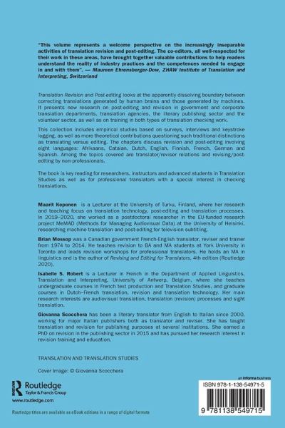Maarit Koponen is a Lecturer at the University of Turku, Finland, where her research and teaching focus on translation technology, post-editing and translation processes. In 2019-2020, she worked as a postdoctoral researcher in the EU-funded research project MeMAD (Methods for Managing Audiovisual Data) at the University of Helsinki, researching machine translation and post-editing for television subtitling. Brian Mossop was a Canadian government French-English translator, reviser and trainer from 1974 to 2014. He teaches revision to BA and MA students at York University in Toronto and leads revision workshops for professional translators. He holds an MA in linguistics and is the author of Revising and Editing for Translators, 4th edition (Routledge 2020). Isabelle S. Robert is a Lecturer in French in the Department of Applied Linguistics, Translation and Interpreting, University of Antwerp, Belgium, where she teaches undergraduate courses in French text production and Translation Studies, and graduate courses in Dutch-French translation, revision and translation technology. Her main research interests are audiovisual translation, translation (revision) processes and sight translation. Giovanna Scocchera has been a literary translator from English to Italian since 2000, working for major Italian publishers both as translator and reviser. She has taught translation and revision for publishing purposes at several institutions. She earned a PhD on revision in the publishing sector in 2015 and has pursued her research interest in revision training and education.