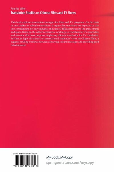 This book explores translation strategies for films and TV programs. On the basis of case studies on subtitle translations, it argues that translators are expected to take into consideration not only linguistic and cultural differences but also the limits of time and space. Based on the editor's experience working as a translator for TV, journalist, and narrator, this book proposes employing editorial translation for TV translation. Further, in light of statistics on international audiences' views on Chinese films, it suggests striking a balance between conveying cultural messages and providing good entertainment.