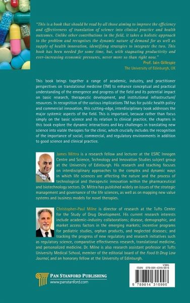 Introduction: Introduction to Translational Medicine. Drivers and Barriers to Translational Medicine: New Light Through an Old Window? The "Translational Turn" in Biomedical Research - A Historical Perspective. Translational Medicine: The Industry Perspective. Drivers and Barriers of Translational Medicine: A Regulatory Perspective. Developing an Evaluation Model for Translational Medicine Research Programs. State of the Art in Science and Technology: Emerging Concepts in Biomarker Discovery: Cancer Immunotherapy and Degenerative Diseases of the Eye as Model Systems. Imaging Biomarkers for Innovative Drug Development: Translation from Bench to Bedside and Back. Translational Bioinformatics: Bridging the Biological and Clinical Divide. Institutional Dynamics of Translational Medicine: Exploiting Translational Medicine Through Public-Private Partnerships: A Case Study of Scotland's Translational Medicine Research Collaboration (TMRC). The Role of the Product Development Partnership as a Translational Mechanism for Delivering Health Solutions in Low-Resource Settings. Conclusions: Is Translational Medicine the Future of Therapy?