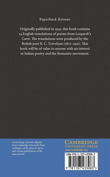 Originally published in 1941, this book contains 14 English translations of poems from Leopardi's Canti. The translations were produced by the British poet R. C. Trevelyan (1872-1951). This book will be of value to anyone with an interest in Italian poetry and the Romantic movement.