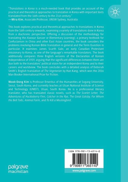 This book explores practical and theoretical approaches to translation in Korea from the 16th century onwards, examining a variety of translations done in Korea from a diachronic perspective. Offering a discussion of the methodology for translating the Xiaoxue (Lesser or Elementary Learning), a primary textbook for Confucianism in China and other East Asian countries, the book considers the problems involving Korean Bible translation in general and the Term Question in particular. It examines James Scarth Gale, an early Canadian Protestant missionary to Korea, as one of the language's remarkable translators. The book additionally compares three English versions of the Korean Declaration of Independence of 1919, arguing that the significant differences between them are due both to the translators' political vision for an independent Korea as well as to their careers and Weltanschauungen. The book concludes with a detailed analysis of Deborah Smith's English translation of 'TheVegetarian' by Han Kang, which won the 2016 Man Booker International Prize for Fiction.